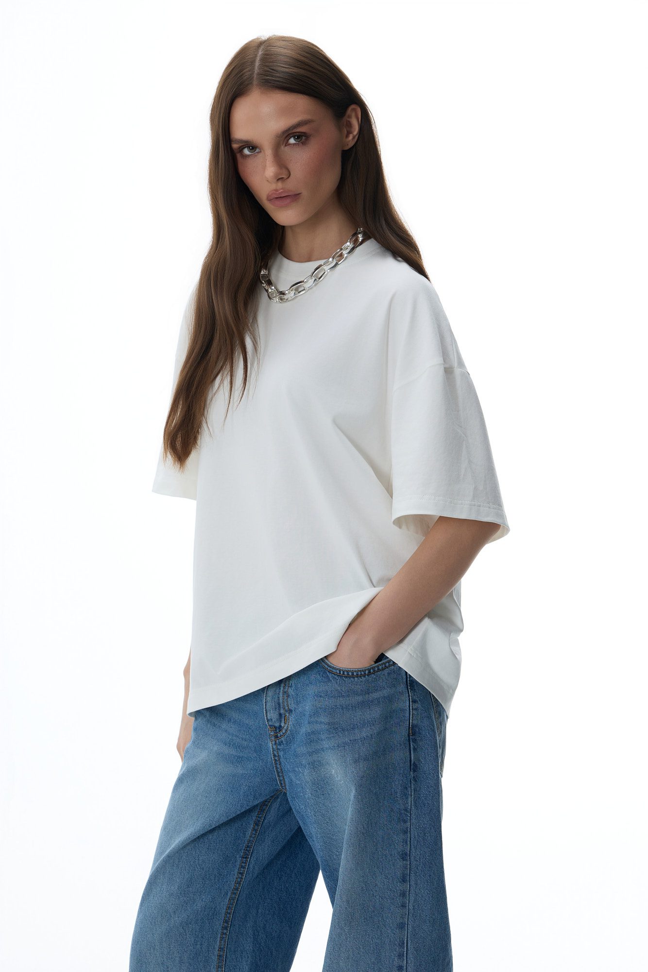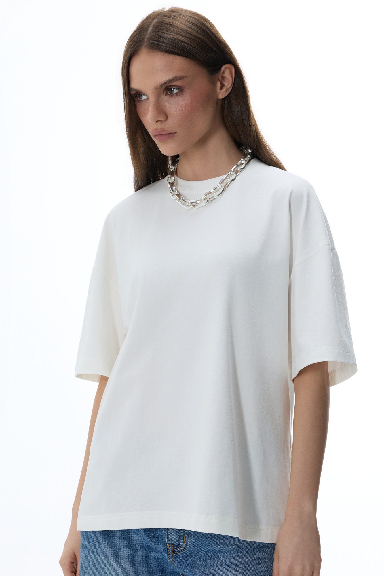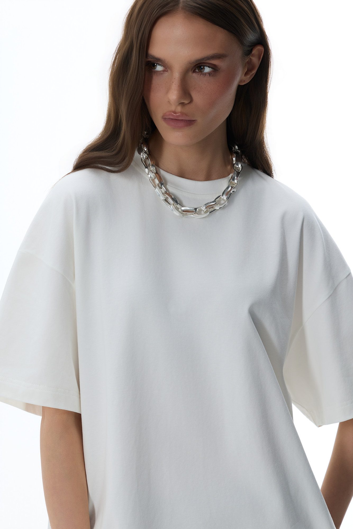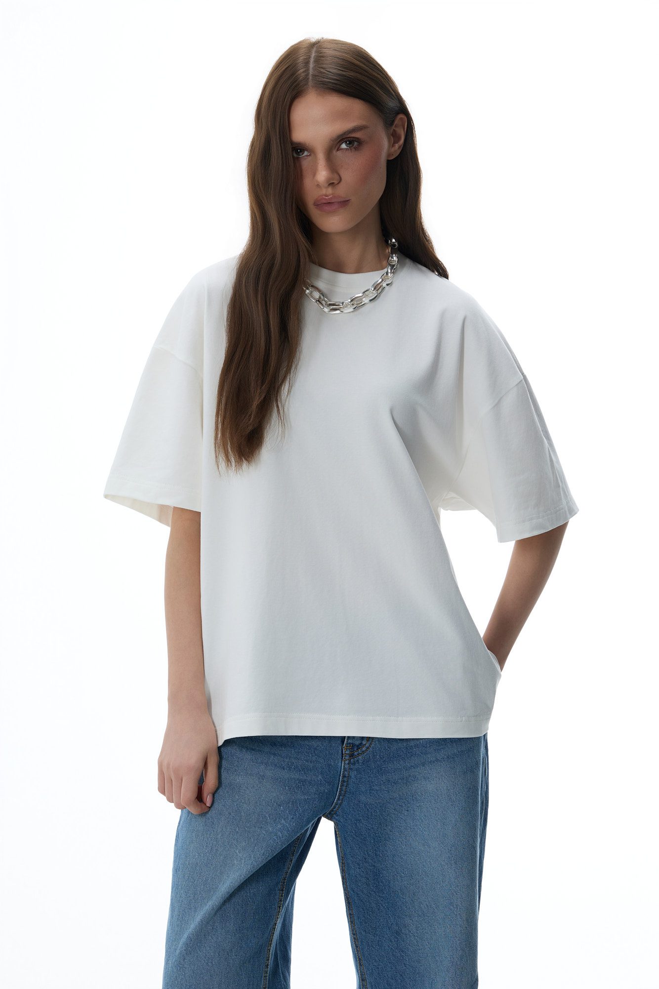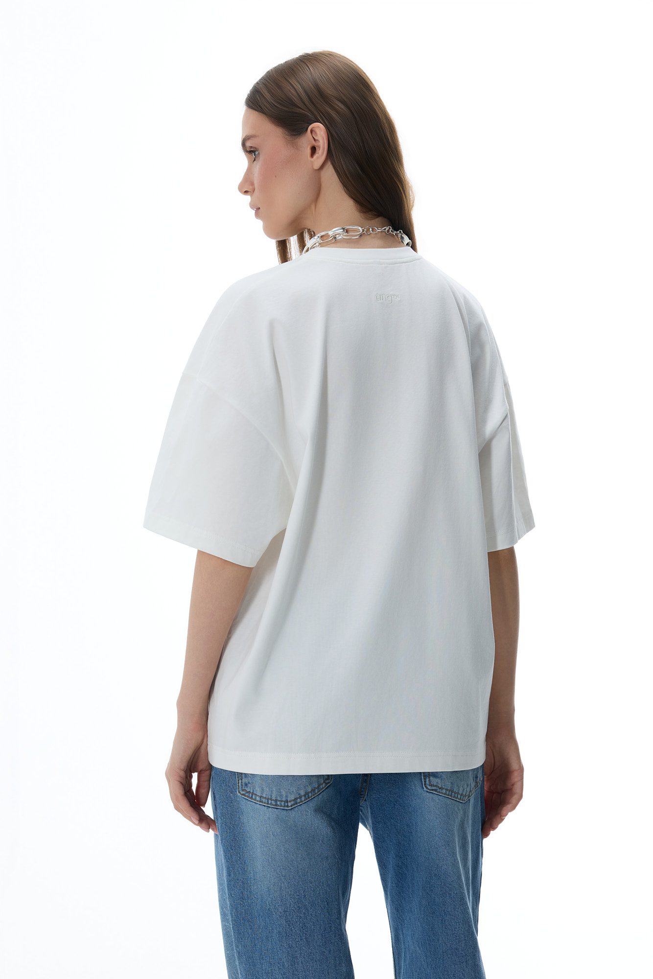 Klasyczny, oversize’owy T-shirt w klasycznym off-white, wykonany z wysokiej jakości, miękkiej bawełny. Przyjemny materiał dopasowuje się do sylwetki, zapewniając maksymalny komfort noszenia. Model z subtelnym logo na karku z tyłu, idealny do codziennych, luźnych stylizacji.