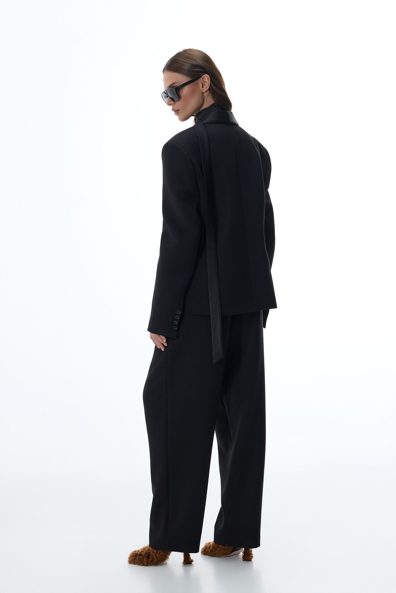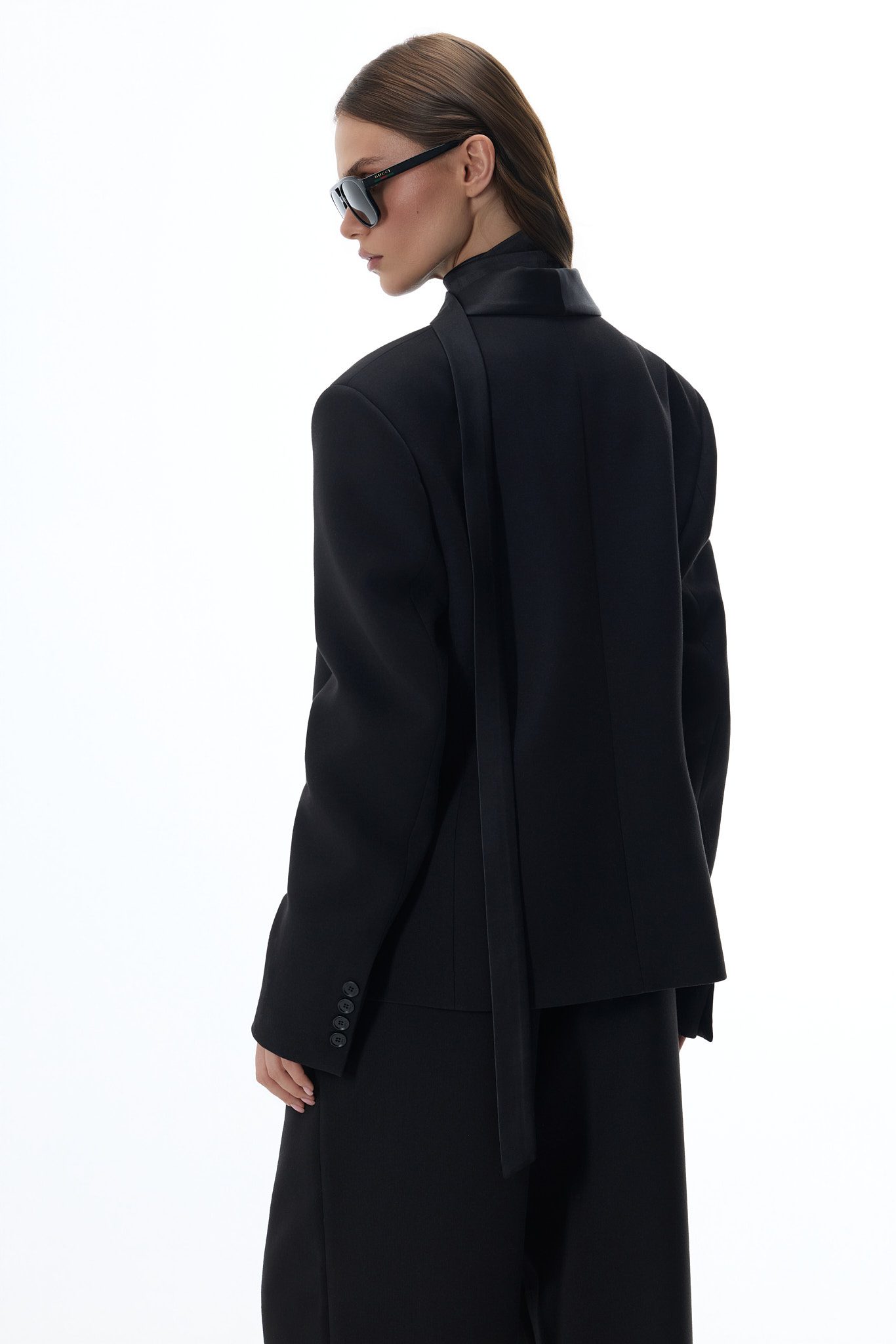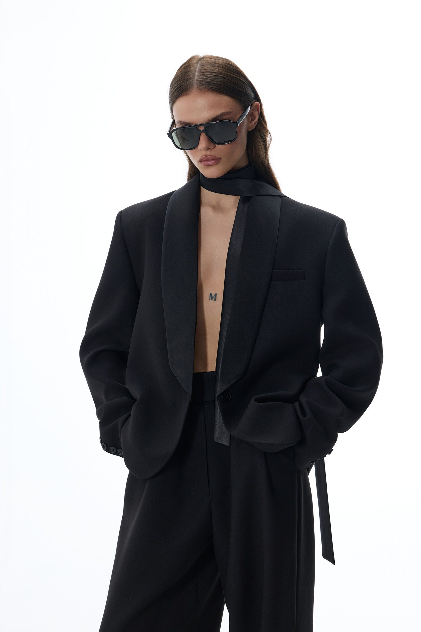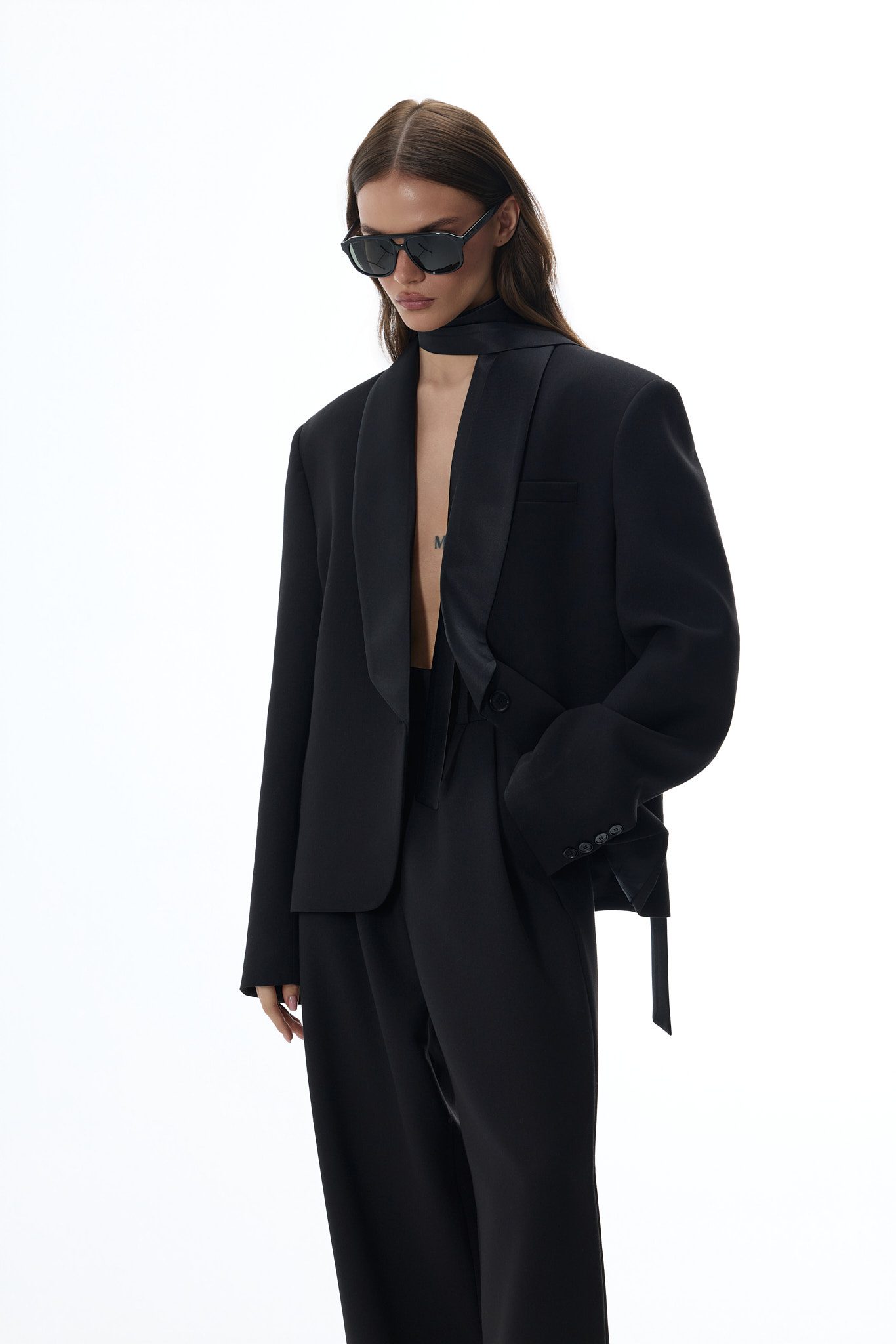 Wyjątkowego charakteru nadają jej szalowe klapy wykończone subtelnym połyskiem, które przyciągają wzrok i dodają stylizacji luksusowego wyrazu. Gładka struktura materiału oraz minimalistyczne wykończenie sprawiają, że marynarka doskonale wpisuje się zarówno w formalne, jak i nowoczesne zestawy.